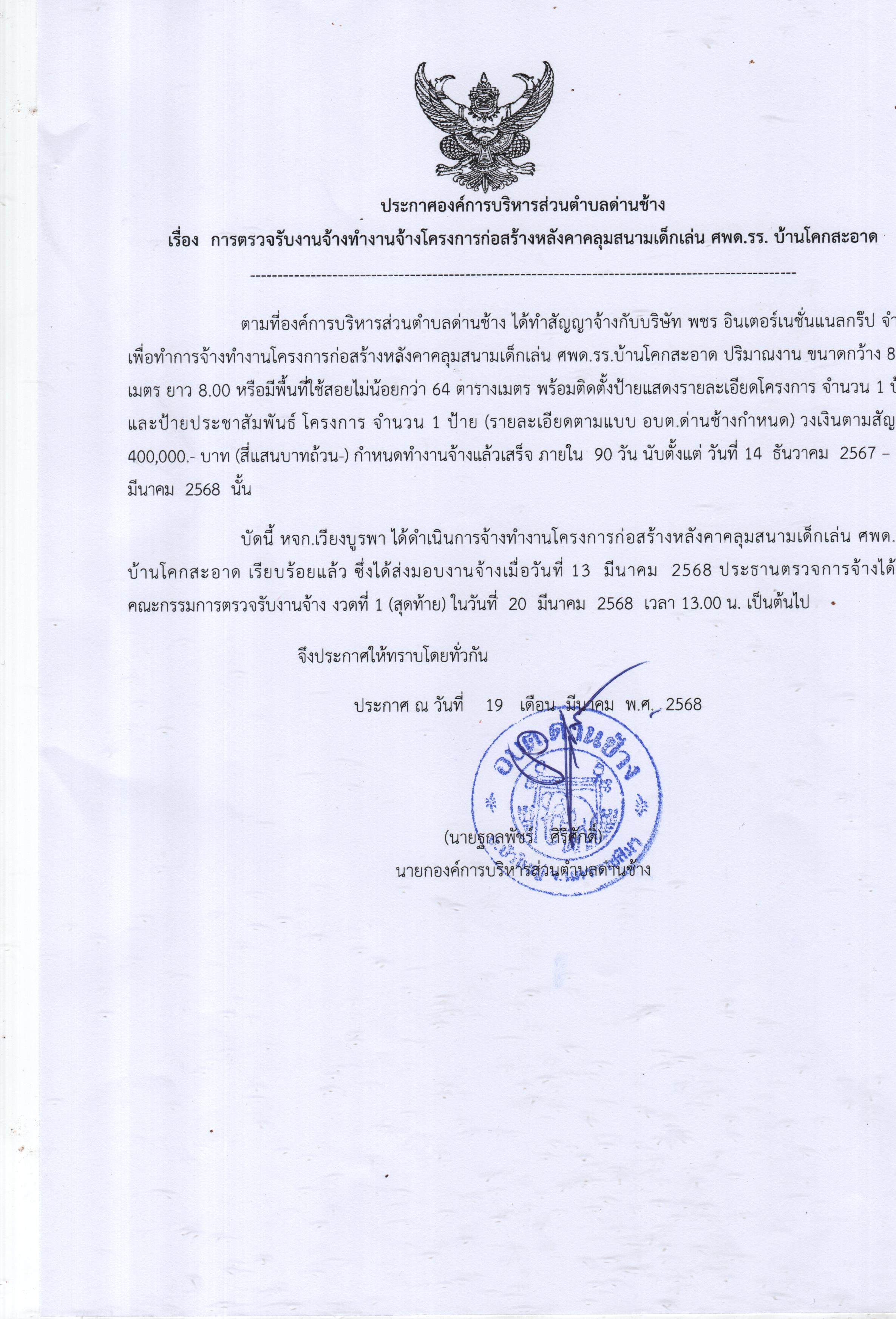 ประกาศองค์การบริหารส่วนตำบลด่านช้าง เรื่องการตรวจรับงานจ้างทำงานจ้างโครงการก่อสร้างถนน คสล.บ้านนานิคม หมู่ที่ 5(ต่อจากถนน คสล.เดิมไปบ้านนายแสวง ใหม่ดี)
